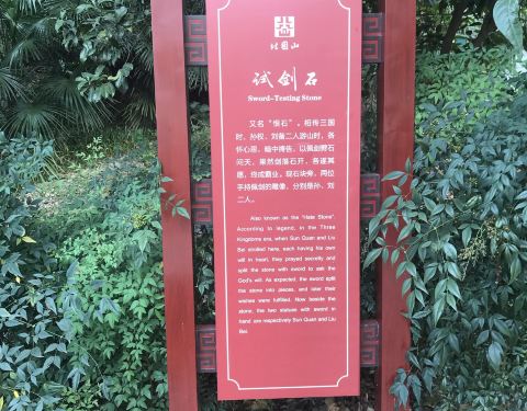 景点位于镇江的北固山景区里面,相传孙刘联姻弄假成真,孙刘为了争夺荆州,在此私下较量,暗卜各人图霸事业成败的遗迹。故而得名试剑石。