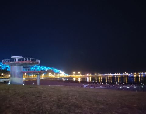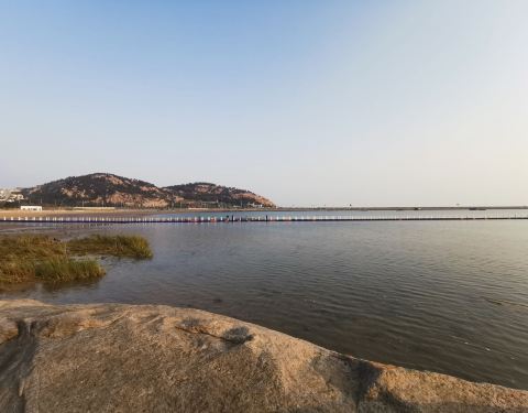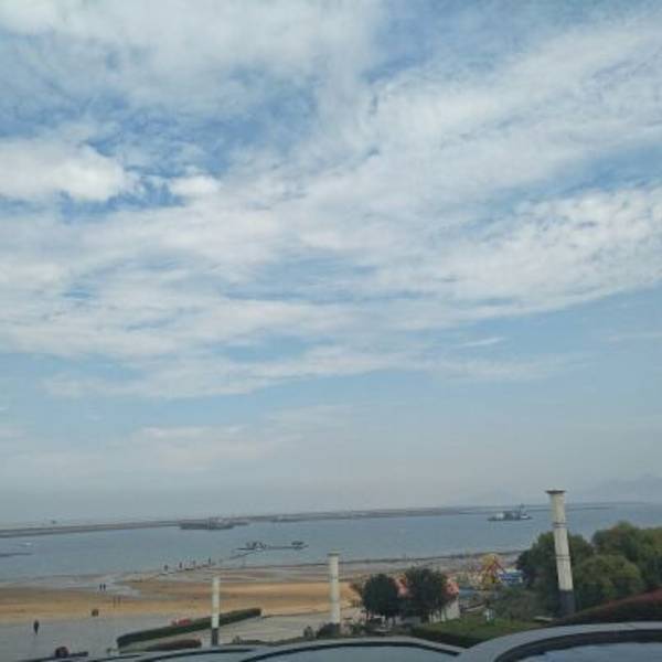 离市区近免费的沙滩公园人超多有岸拦住不是直通大海傍晚在沙滩上的人超多,在去连岛的大桥拐弯处,景色也就那样,和上海浦东那块收费的那个沙滩差不多反正都是围起来的。