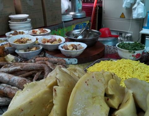 汉人街,多为汉族食品,有熟悉的粽子、粉面,维族食品也有,摊位多,热闹。
