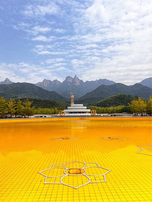 没有进弘愿堂,直接向右沿着景区的路走,走到底是佛光池,佛光池用金黄色的瓷砖铺设而成,看起来金灿灿的。九华山地标性的笔架山和狮子峰与高大的地藏菩萨铜像构成了水中壮观的倒影,在阳光照耀下,波光粼粼,金光闪闪,神奇壮观。
