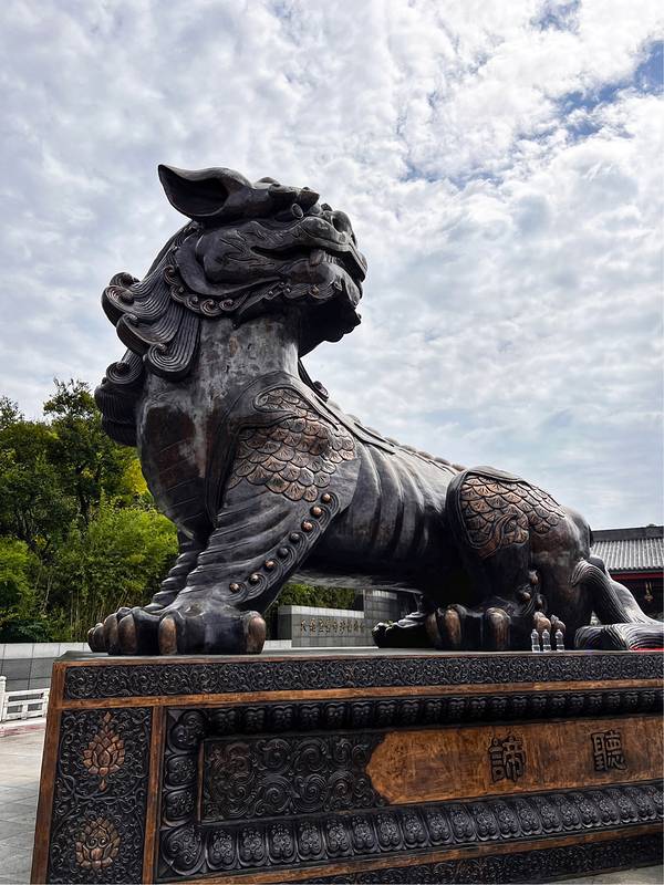 九华山标志性“谛听”神兽铜像是地藏菩萨经案下伏着的通灵神兽,可以通过听来辨认世间万物 ,尤其善于听人的心,在名著《西游记》中有述说谛听辨别真假美猴王的故事。