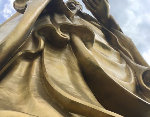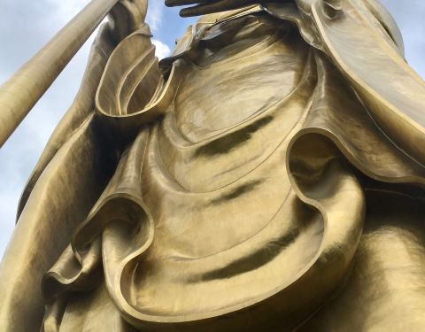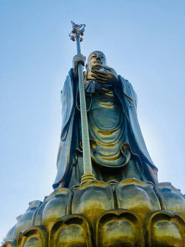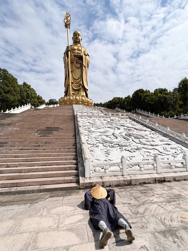 最后到了地藏菩萨露天铜像前,很多信徒在跪拜祈福,它是九华山国际性佛教道场的标志性景观。据说九华山地藏菩萨露天铜像,像身高度84米,加上莲花座底盘高度99米,是世界上最大最高的地藏菩萨露天铜像。地藏菩萨为比丘相,右手持锡杖,左手持摩尼宝珠。面向西北方,端庄慈祥,以示“昭示众生,国泰民安”。
