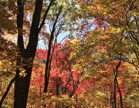 关门山森林大峡谷,在枫叶满山时,4月份去的,人不多,很舒服很惬意。穿梭在林间,走走停停拍拍,累了还有电屏车,不过走路没多久。之后可以去小市喝羊汤吃饭。