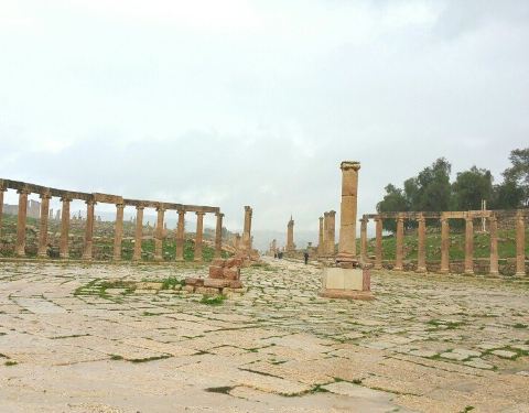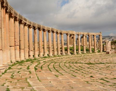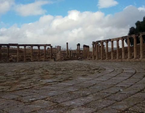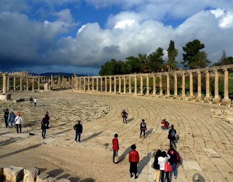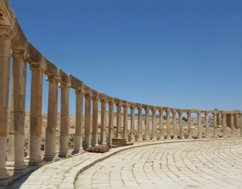 约旦杰拉什椭圆形广场 现存古罗马古迹中保存最完好的圆柱广场,在罗马时期广场是集会和举行重要庆祝活动的场所,中央曾有一个正方形高台,安放着一座雕像。广场这里是最能代表杰拉什的形象,因此也是游人最喜欢的拍照留念地点。