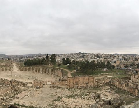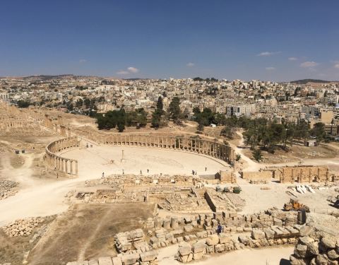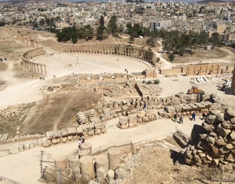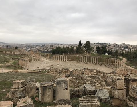 站在高处看这个椭圆形广场,真的壮观。这是目前我看到的保存最完好的圆柱广场,虽然有些是7世纪补建的,但这些爱奥尼亚石柱还是完美地环成一个圆,让杰拉什古城在起点就大气地逼人眉眼。
