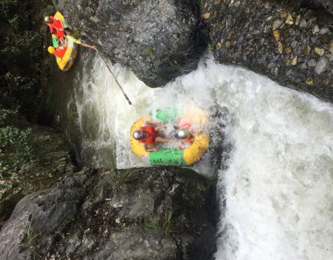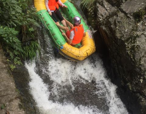 九咆界漂流位于下山的半途中,借着山势而建。出发点上是一个小水库,如果漂流水位不够就开闸放水。山势有些陡峭,落差比较大,刺激性很强。不过水道较窄,橡皮艇容易卡住,又降低了娱乐性。这里漂流的人不多,因...