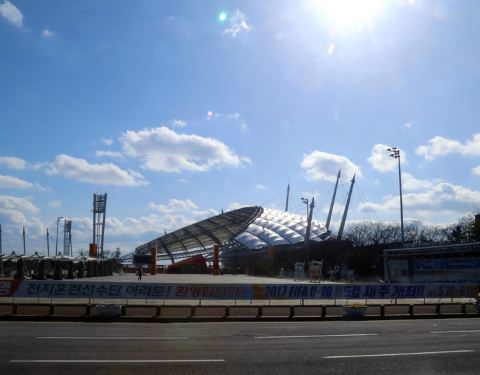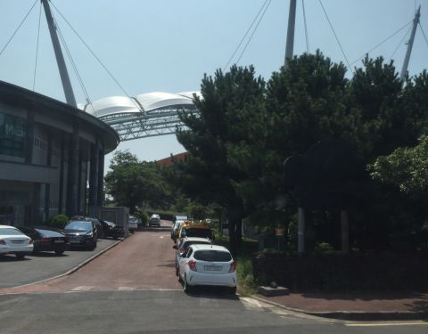 没来济州前, 还不知原来这里曾协办过2002年的世界杯, 刚巧晚上要来超市买东西, 便顺路看一下, 在外边看可以看到一个颇大的球场, 但比起我心中的世界杯的球场, 要细一点了. 由于关了门, 没能入去看看. 如果你不是一个足球或者健身爱好者,我不会绕道去那里,但是如果你有时间,并且很有活力,去那里很有趣。这个竞技场本身不算大(35000个座位)。但是这里相当现代,有真的现代真的很美丽的屋顶,看起来像天蓬。在这个建筑中(电影院,餐厅)有很多东西可以做,但是一定要进入竞技场里面,你能自由自在,这对你来说是个很开心的惊喜。我觉得在比赛日去那里比较好。但是我没有这个机会。
