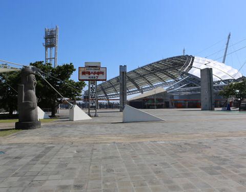 济州世界杯足球场坐落在西归浦市的南端,是韩国所有足球场中一个建在海边的球场,被誉为是“世界上非常美的足球场”。2002年的韩日世界杯赛中,中国队曾与巴西队在这里交手。在现代化概念的前提下,这座体育场充分结合了济州的自然历史及传统文化。整个体育场的外形与济州的地貌一样,像一座丘陵,也像一艘济州传统的木船,而覆盖在体育场主看台顶上的用钢架和帆布建成的顶篷则像一张硕大的渔网和一面鼓起的船帆,其精美的构思,让观者无不赞叹。