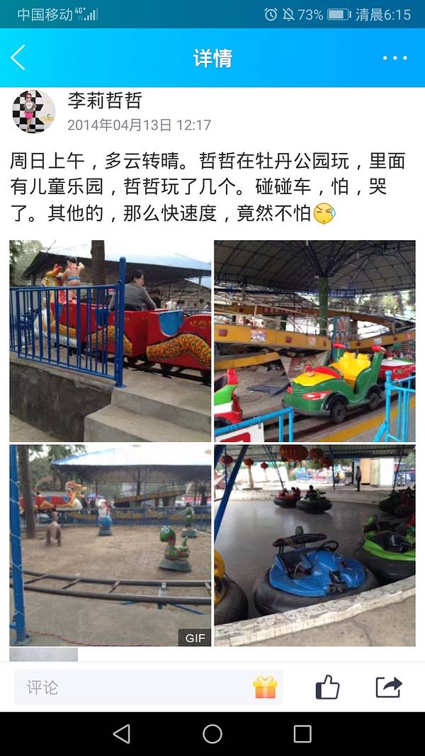 上午,多云转晴。哲哲在牡丹公园玩,里面有儿童乐园,哲哲玩了几个。