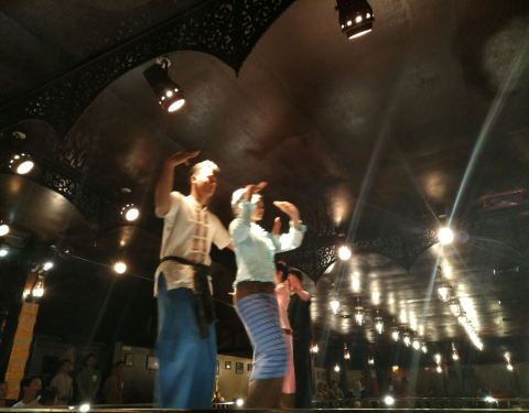 不过也挺有意思的 :)。) 同时还可以看表演,不错的体验.甚至不知道他在表演什么在当地旅行社预订了帝王餐,由专车来酒店接送. 餐厅可以席地而坐也可以坐在椅子上. 我们的位置是正对舞台的1号桌,有靠垫,但说实话时间一长还是有些不习惯. 地上摆了一个红色小圆桌, 固定的几个菜,你可以无限制的添...在当地旅行社预订了帝王餐,由专车来酒店接送. 餐厅可以席地而坐也可以坐在椅子上. 我们的位置是正对舞台的1号桌,有靠垫,但说实话时间一长还是有些不习惯. 地上摆了一个红色小圆桌, 固定的几个菜,你可以无限制的添加(只要你吃的下~~) 同时还可以看表演,不错的体验. 吃晚饭后再到旁边的小剧场里看另外一场表演,除了之前的原班人马外,还有些当地人,特别原生态...甚至不知道他在表演什么...不过也挺有意思的 :) 展开