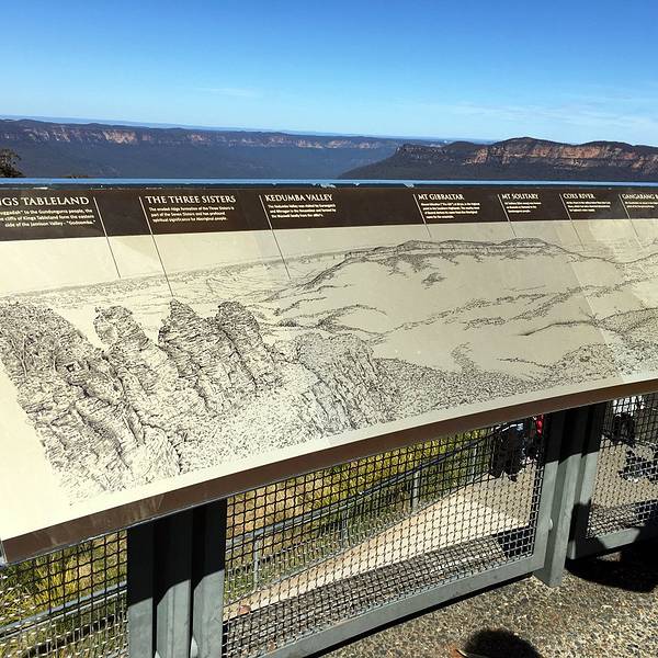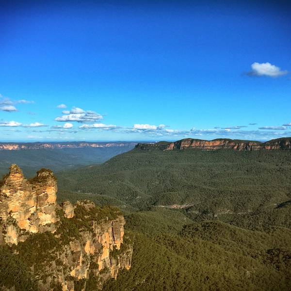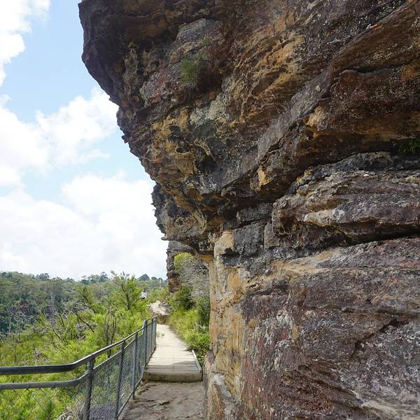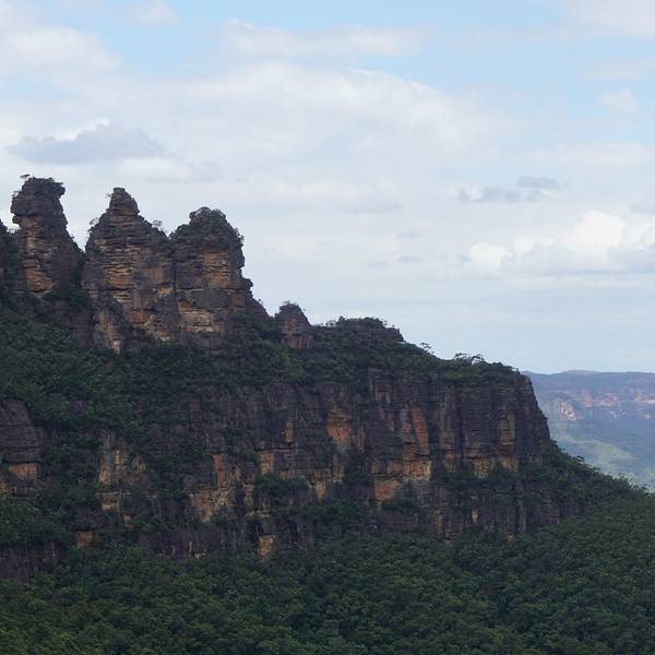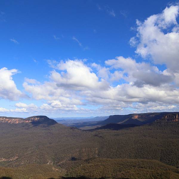 回声角(Echo Point)平台是欣赏Blue Mountains的最佳处,丛林、峡谷近在眼前,不过依我看来风光不及张家界地貌。如果单从形态上看蓝山三姐妹峰比张家界的十里画廊三姐妹峰形态上差了点。不过在四周山峦峡谷深深、悬崖绝壁中,又显得气势不凡。三姐妹峰的名字来源于当地土著的一个古老传说,传说出生在Katoomba部落的三个漂亮的姐妹违反了部落的规矩,同时爱上了山下另一部族的三兄弟,而引发一场部落之间的战争,部落巫师为了保护她们免受伤害,战前将三姐妹变成了石头,没有想到的是巫师在战争中被杀,因而咒语无法解除,导致这三姐妹永远只能耸立在悬崖上,为后来人讲述着这动人的传说。蓝山海拔1100米,峡谷深深,。园内生长着大面积的是尤加利树(桉树),它是澳洲珍贵的动物考拉的唯一食品。