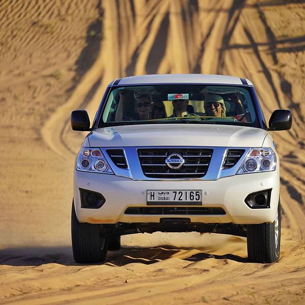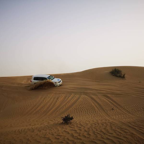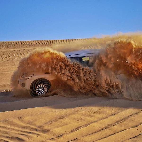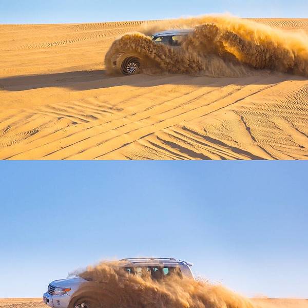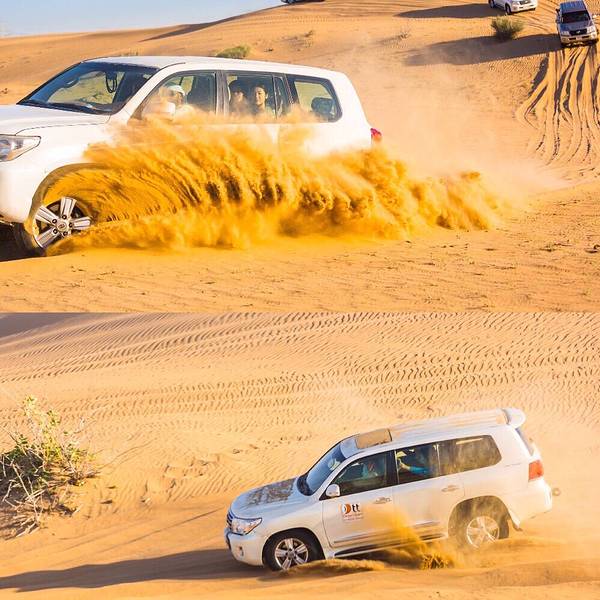 来游览迪拜附近的沙漠,我一定要体验这里的越野车冲沙。大家开着越野车自由的在沙丘上上下起伏的行驶,感觉非常的刺激。因为在这里不需要守太多的交通规则,可以尽情的冲上沙坡,从上俯冲而下,给人感觉特别的兴奋。