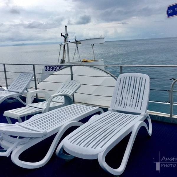 在空间宽敞的多层海上观光平台上, 提供绝佳的观景视野和休憩空间。(吃喝拉撒当然也是在平台上,有免费的点心和白水提供,饮料需要付费)