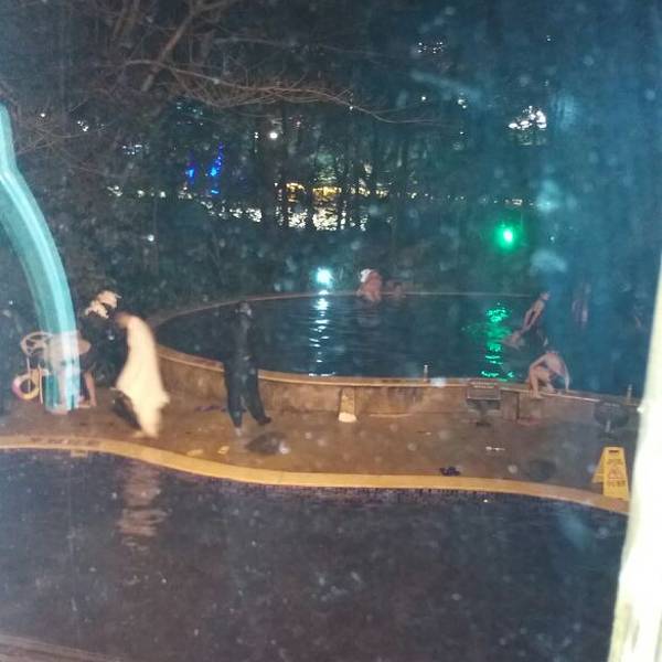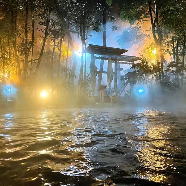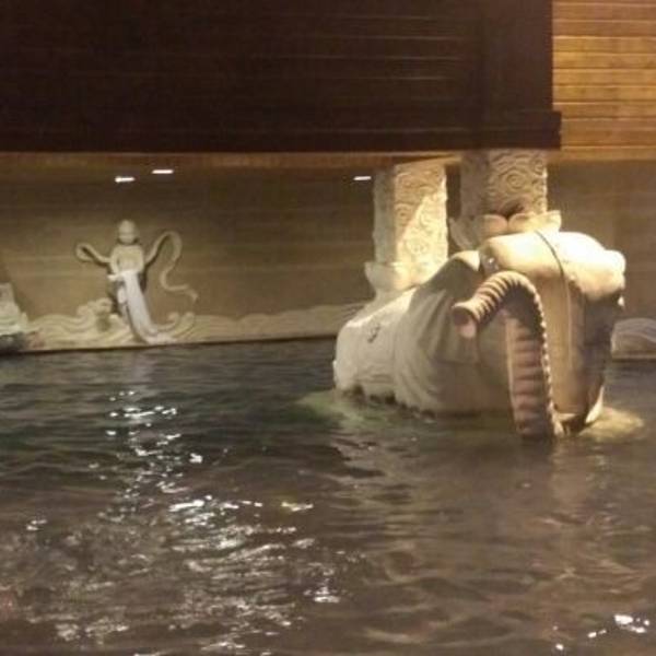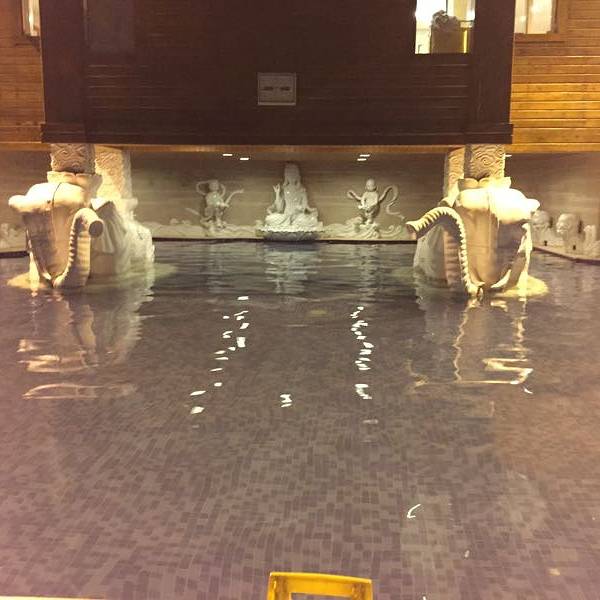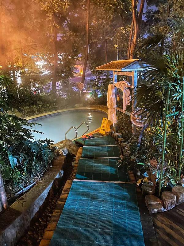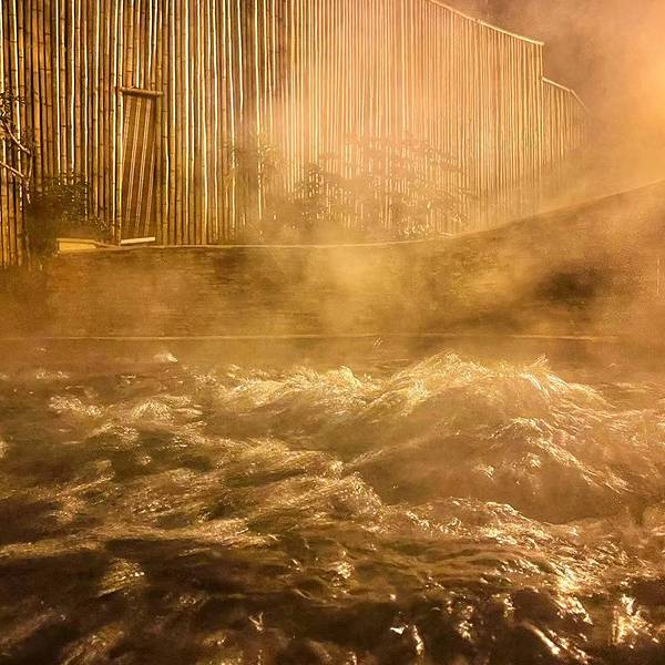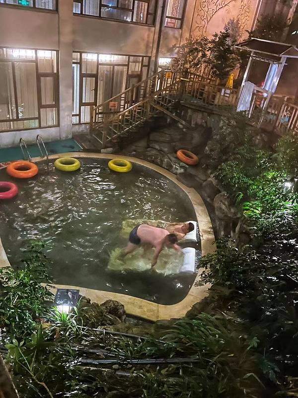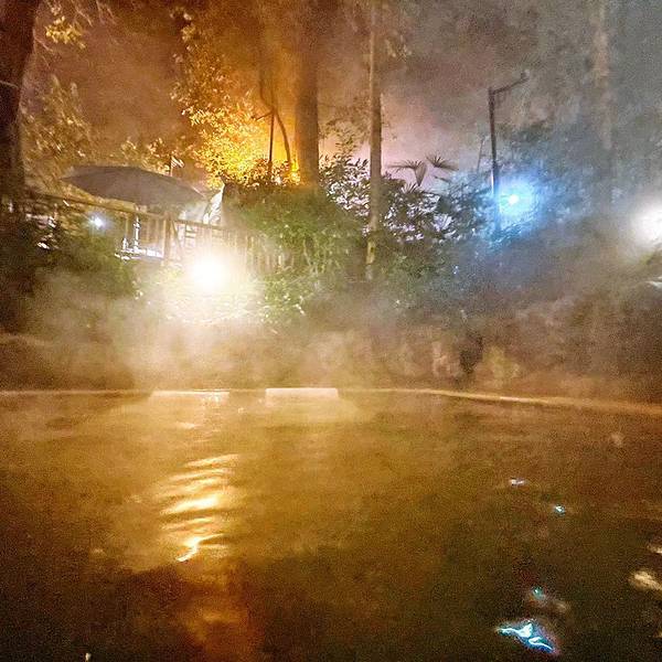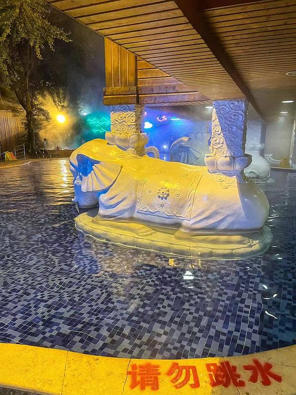 换好在泳裤,缩手缩脚的走出来(峨眉山脚下当天下小雪),先走进一个靠出口的温泉池,把身子先沉下去,总算身子有了些热气。这个温泉池是热气腾腾,一侧有些可以躺下的设置,摸索着躺下来,水的浮劲挺大。透过温泉的硫磺热气,两侧合围的建筑,泛着些灯光,一些人在很随意的闲聊着。在这样一个寂静的地方,浸润着天然的老天赐予的温泉,身心会很自然的放松开来,话题是什么?聊什么?都不会是最重要的。