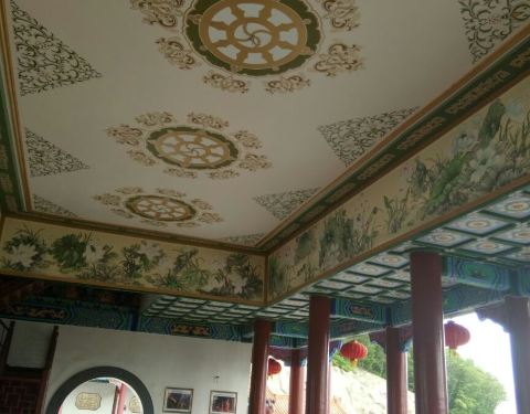 原来是上长白山天池,因受‘’苏立‘’台风影响不能上山,改变计划到敦化,导游推荐我们自助游览六鼎山景区。果然不虚此行,上了山,以虔诚的心,来到金鼎大厅,套上鞋套拜佛,场面极为壮观。大厅中央厅内四面佛像环绕,厅的上方穹顶犹为清澈,深奥……象征佛海无涯……