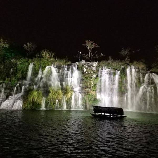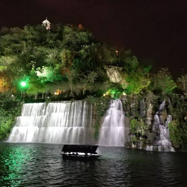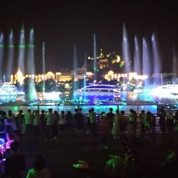 柳江游船看柳江夜景喷泉和瀑布是最近距离的接触,每个晚上喷泉开放时游船都会开到喷泉后面为喷泉的增添光釆