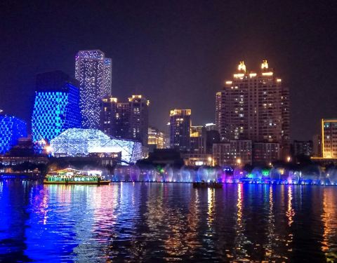 夜晚乘坐游船,两岸的建筑让彩灯装饰的分外美丽,既有古建筑的神秘色彩,又有现代化小区的时尚美,游江的人很多,一定要提前订票,带好雨具。