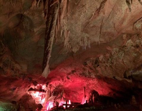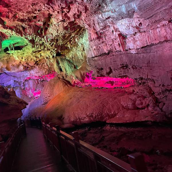 通过长长的地下隧道,进入了地下河流,千奇百怪的钟乳石在五彩的灯光的照耀下,精彩不断,地下溶洞很大,还有光影表演,很不错!
