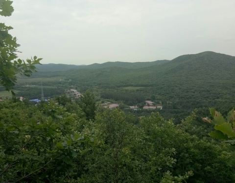 登山远眺,群山起伏,波澜壮阔,好一派北国风光。山上林木茂盛,松树、柞树居多,还有杜鹃花海