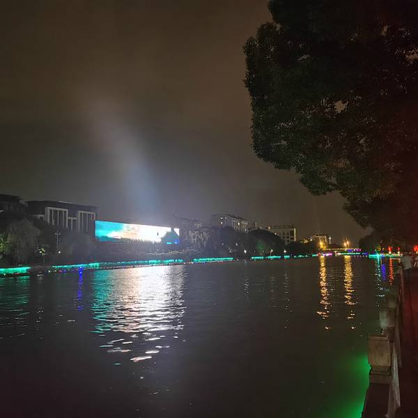 ...饭步行到绍兴护城河,夜景很一般,有一个大屏幕,正在播放春晚,真的怀疑,是不是找错地方了,太黑了在农校食堂吃的晚饭,吃完饭步行到绍兴护城河,夜景很一般,有一个大屏幕,正在播放春晚,真的怀疑,是不是找错地方了,太黑了。