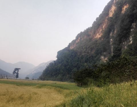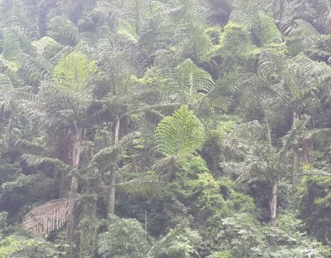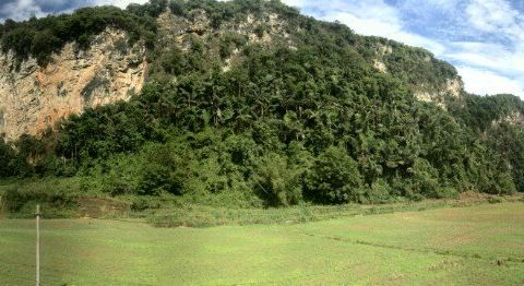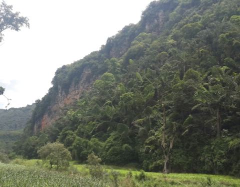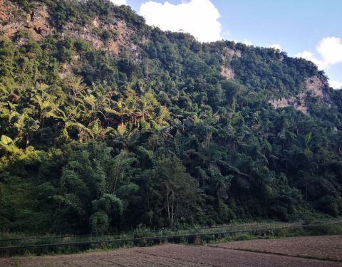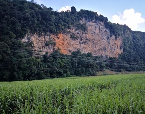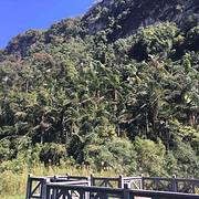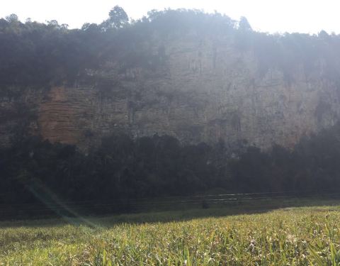 欣赏十里甘蔗绿成毯,还有那与恐龙同时期的植物“龙棕",远处崖壁上隐约可见远古遗迹。