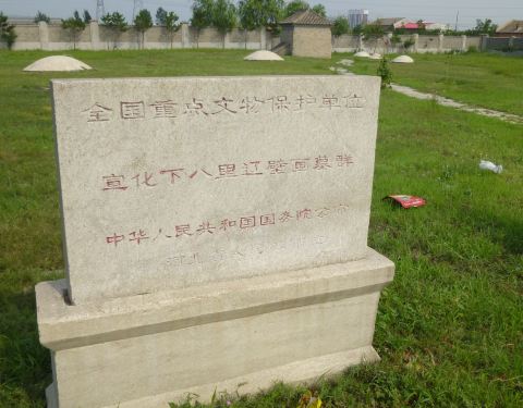 在张家口和宣花之间的下八里村,注意路边的标志,沿路标直走一里地就到了,从虚掩的大门能免费观看墓群全貌