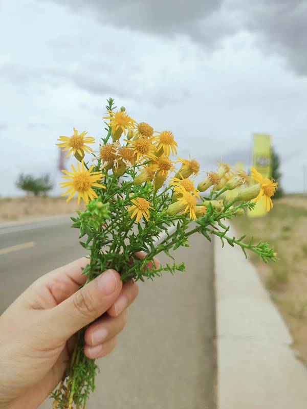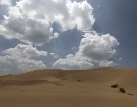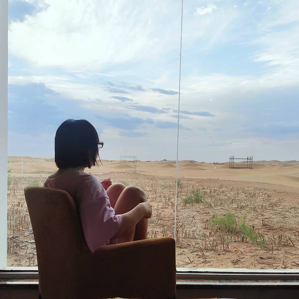 看沙漠其实不一定要到夜鸣沙。库布齐沙漠是我国第七大沙漠,范围非常大。比较火的景区有距离包头市几十公里的响沙湾,内有比较有名的莲花酒店,但是价格偏高。还有比夜鸣沙再远一点的七星湖景区和酒店,酒店是摩洛哥风格,价格比莲花酒店稍便宜些,也有北区草堂平价的房间,但是网上显示没有房间。响沙湾和七星湖都可以参加一日游。夜鸣沙是无意中在一个游记中看到的,有大大的落地窗,价格平价,又有班车,住一晚看星空刚刚好。 去夜鸣沙本来还有一个方案是晚上出发至乌拉特前旗,但鉴于一个人半夜到,周边又没搜到酒店比较危险,就选择了第二天早上的火车,顺便白天可以看看路上风景,车程3小时。实际上车站对面就有宾馆,路上风景也没什么特别。如果是晚上到,第二天上午可以先去乌梁素海,再去沙漠。 一下火车我先去对面的汽车站买去夜鸣沙景区班车的票,查的攻略是下午3点50有一班车。然后一问,班车12点多有最后一班,但是因为修了新路,不能直达景区,比较著名的穿沙公路也被封。好在幸运的是赶上了最后一班车,还遇到了在景区工作的大叔,半路下车后找了车给我带到了景区。车程约1小时。 到了酒店立马感觉舒服了,外观看起来不是很好看,但是里面还不错,房间面积也比较大,装修比较新,设施很贴心的有加湿器,冰柜。窗外的风景每个房间略有不同,要看运气。因为窗户外面紧接不是原始的沙漠,所以楼层高一点的会更好。坐了半天车还是有点累,太阳也比较大,就在酒店多多休息了一会,等4点多钟太阳小点了才出门。然而4点多太阳依旧很晒。酒店附近游玩的人很少,有一些从山西过来玩越野车的,有个越野车基地,酒店的人说平时北京也有很多人来玩。一个人走到酒店后面的沙漠坡上逛了一下,风太大太阳伞打不起来,很快就晒得有些刺痛。人真的太少了找个拍照的人都不容易,最后找了牵骆驼的阿姨帮忙拍了几张,下午没看到骑骆驼的人,阿姨说上午有几个骑的,受疫情影响旅游业的打击真的太大了。沙漠往里面有滑沙等娱乐项目,我一个人不想玩就没有去。玩的话会有车给送到里面。除了晒,第一次去沙漠真的被震撼到!逛完了酒店后面的沙漠,走到前面的路上又逛了逛,路边黄色野花很漂亮,忍不住揪了一把。路边有牛群吃草,场景着实有点美。回到酒店,云层已经越来越厚了,特别在太阳的地方尤其厚,有光束洒下来。没有看到长河落日圆的场景比较可惜,当然星空也是没看成的。我相信下次还是有机会滴。晚餐吃的酒店的凉拌莜面,味道真不错,口感有点像牛板筋,比较有嚼劲。睡前饿了,又吃了泡面,酒店的自动售货机有售,价格和外面一样。