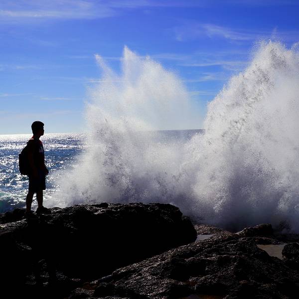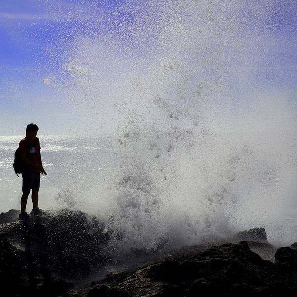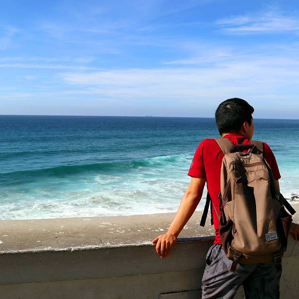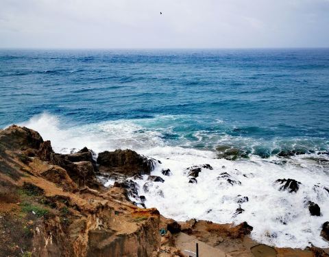 继续楼梯往下走就是海边,海边有很多岩石,被浪花强烈地拍打着,有很多坑坑洼洼。下午去时阳光很猛烈,而且背着海拍照会有些背光。