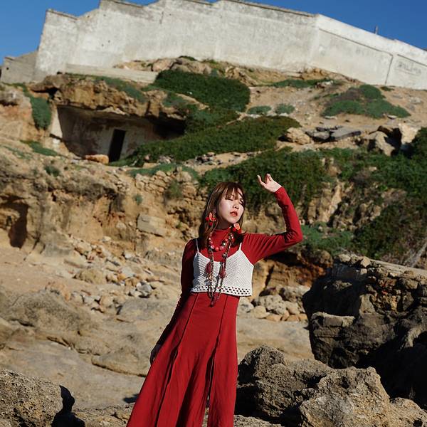 【源自大西洋间的鬼斧神工】 向着灯塔左侧的一路驶去,沿途的大西洋壮美海景便不断显现,而当中作为丹吉尔城市名片存在的景点便是——赫尔克里洞穴 严格上来说,这里不算一处景点,仅是旅行者发掘的一处意象景观。赫尔克里溶洞,当地人称之为大力神洞,源于天神持斧劈山的希腊传说中。而当我们深入溶洞内,发现面积不大但确有那番韵味,幽暗深邃的洞穴内透着一处海天的景观,这是长年间海浪冲蚀岩石而形成。而在观赏这处自然“杰作”时,不经意便会发觉洞口形状神似非洲版图,甚至神奇地精确至马达加斯加,所以也才有了“非洲洞”这一叫法。当驱车来到溶洞入口处时,便已被洞穴外部的景致吸引住。安达卢西亚风的白色建筑搭配无际蓝的大西洋让人心动不已。这是我们近距离大西洋的一次,这片波涛浩瀚的深海与以往所见都不相同,那种透彻迷人的深蓝与沁人心扉的海风,会是一种令人难忘的奇景海岸。站在岩壁之上,面对汹涌的浪潮,来上一张惊涛骇浪般的“大片”,好像足够这哥们自恋好一阵子........但其实这一张“大片”的背后,实际上是无数张如此囧、怂的真相↓↓↓