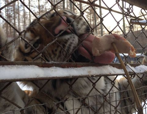 东北横道河子虎园散养了不少老虎,因为是山里气温低,十一去的时候天有些阴都要穿羽绒服了。冻的大家都选择坐封闭的车,虽然带网的车观看效果更好。进去先坐车到散养虎园,投喂一只鸡,看老虎吃鸡。我们车上有人花100买了一只鸡,有幸更好角度看了一次。下车后还可买肉串喂老虎,有表演,还有熊,鸟等动物。