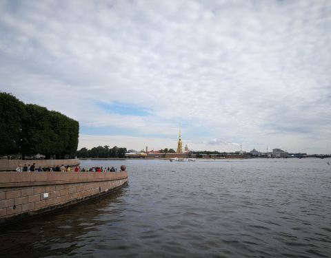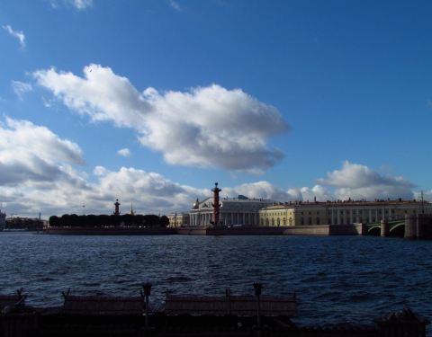 瓦西里广场的港口两侧,树立着两根巨大的圆柱,这是曾经为入港船只导航的灯塔。灯塔呈现砖红色,上面有船头形状装饰,基座上有四座雕像,分别象征着俄罗斯四大河流。 港口这里的河面很宽,可以看到对面的冬宫和远处的彼得保罗要塞。