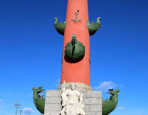 灯塔呈现砖红色,上面有船头形状装饰,基座上有四座雕像,分别象征着俄罗斯四大河流