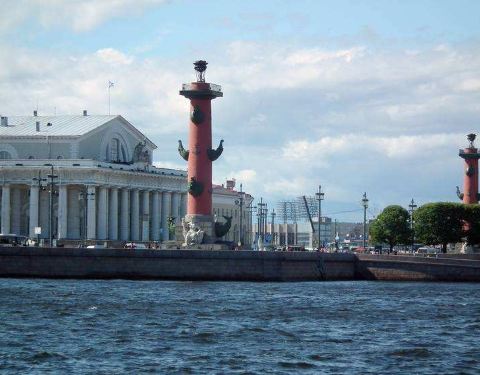 圣彼得堡最古老的区域是瓦西里岛,瓦西里岛上有个古港口。在古港口广场两侧,耸立着两根船头形装饰的石柱,柱高32米,是为入港船只导航的灯塔。