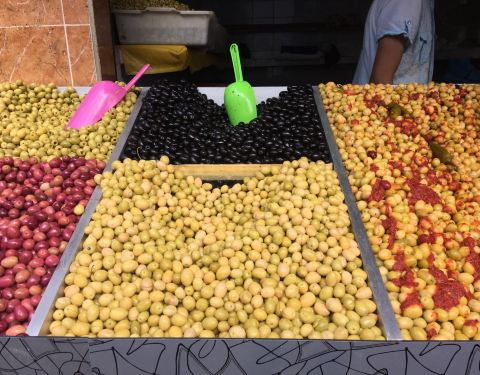 和非斯的老城差不多,但规模要小。沿着湿漉漉的石板地,象进了菜场。水果蔬菜、鱼和鸡,甚至还有鸽子买;橄榄的制作有十几种,很接地气。