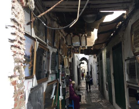 休整片刻之后,Walid回来了。我们正好也想出去转转,顺便买个当地的手机SIM卡。 我们顺着七拐八绕的小巷子一路走出内城,回头随手拍下一张照片。狭窄的城墙拱门,犹如一条时空隧道,外面的大街车水马龙,里面的世...