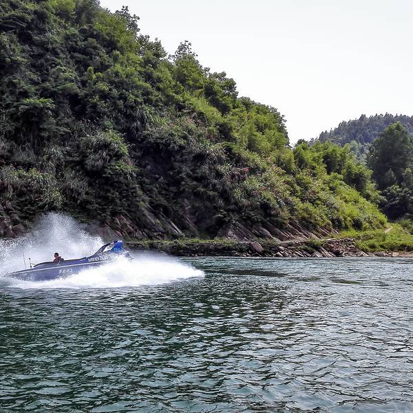 茅岩的景区都是特别适合夏天去的,一个是九天洞,另一个便是喷射飞艇与漂流。茅岩河是澧水上游50多公里长的一段河。茅岩河可分为两段:上段为平湖游,起点是九天洞下的苦竹河,经青安坪,然后到终点站鱼潭电站;下段是漂流,起点是温塘镇热水坑,然后到达市内。午后,我们从九天洞坐车前往今天要参加的喷射飞艇的地方,距离不远,但是车整整开了一个小时。这种事不用惊讶,因为在整个湘西地区就是这样的!车一路经过苦竹寨后再转向我们接下里要前往的地方,这里也是今天的最后一个景点。一路上大家都在讨论天气这么热,一定要玩水才过瘾。但后面的玩水项目确实让我们吃了一惊。因为西线景区这边开开始运营。所以基本上接待能力还不够成熟。值得庆幸的是西线除了原定的漂流意外更是在开业前夕为这个夏天引进了亚洲首条高山峡谷急流喷射快艇。这种项目本来是新西兰开辟的,但爱玩的中国人总是能找到好玩的东西。在随处可见漂流的时代。大家总是希望能多一些好玩的水上项目。具体这快艇有多刺激!坐上去以后你就知道了。就是在这条名为茅岩河的峡谷中,我有幸作为首批体验者来感受亚洲首条高山峡谷急流喷射快艇。值得注意的一点,在快艇附近需要防止一些凉棚或者防晒伞之类的。不然如果玩这个的人多了以后根本就是晒得受不了。切记要防止中暑。在岸边苦等了四十分钟,我终于登上了快艇,没错。就是这个亚洲首条喷射式飞艇。我已经热的受不了。我就是要下去湿个身,吹吹风风凉快。凉快!开飞艇的司机是从国外借过来。据说驾驶技术一流。在上船后先带我们试了一圈以后便询问大家是否安好。在表示大家都安好以后便开始了惊险刺激的湿身。速度飞快到感觉整个船就要起飞了。驾驶员直接一个刹车,回旋,一甩!一连串的动作在一秒内完成。这个飞艇的头瞬间插入水中。船尾甩起了千层浪花。直接拍打在我们的脸上。一下就凉快了。这次是真的凉快了!除了飞艇,还有亚洲最长的漂流是非常值得前往体验一次的。没错,这就是张家界的西线旅游景区。如果你在天门山和武陵源看够了山,那就来西线旅游景区这边凉快凉快吧! 伴随着尖叫与湿身,我们的整趟旅行也接近了尾声!如果你想“湿” 那就来张家界吧!