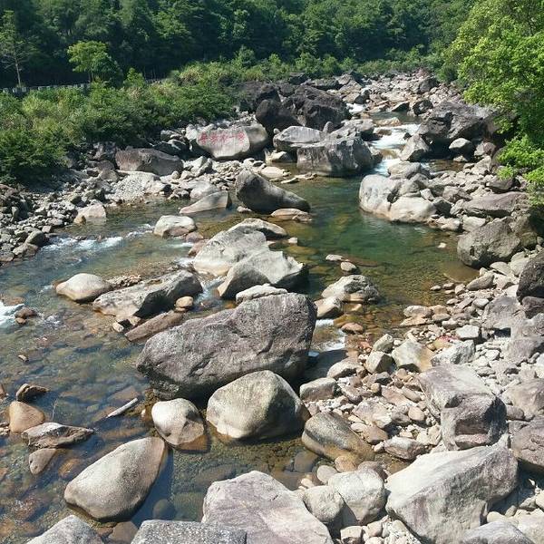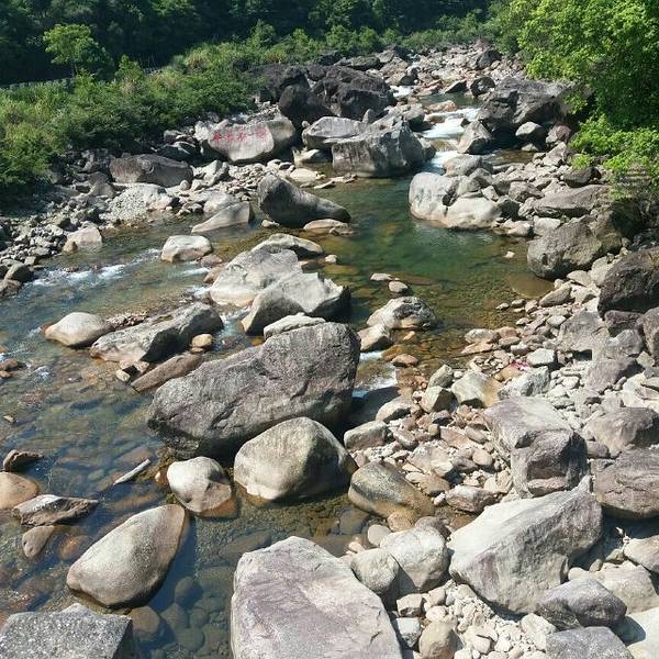 皮筏艇漂流线,起点在青龙洞口瀑布下游。这里溪水清澈,溪水河道上大大小小的岩石阻拦下,时而平静,时而湍急,有一定危险系数。本来己订好票,结果被告知山中暴雨水涨,只得做罢。