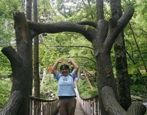 八月份的柴河小九寨,秀色可餐,处处风景皆入画。以前进山是可以乘坐森林小火车的,但是我们去的时候看样子小火车已经停运很久了。真的是很可惜,工作人员说:“虽然不能坐小火车进山,但是你们和小火车合个影吧。” 我大美龙江的杰作——柴河小九寨