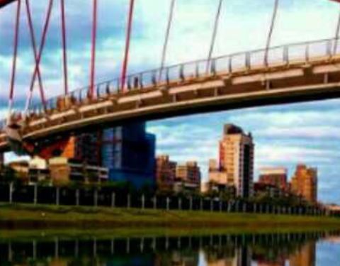 只可以行人通行的步行桥,夜景挺美,吊塔是直的,桥面是一个弧形,鸟瞰像一个彩虹