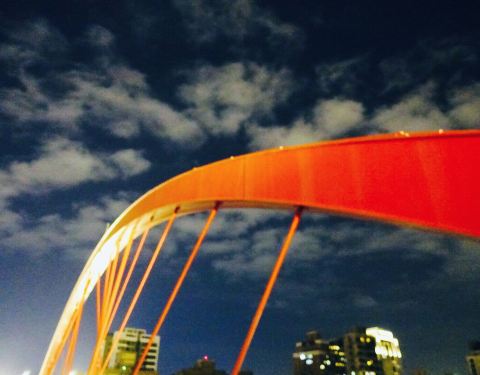 在饶河街观光夜市吃完饭,吃的太饱逛逛无意撞见的景点。 只可以行人通行的步行桥,夜景挺美,吊塔是直的,桥面是一个弧形,鸟瞰像一个彩虹。