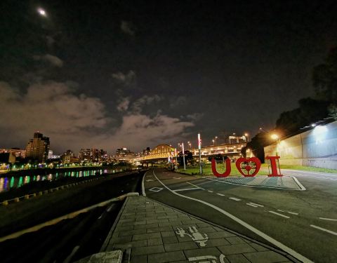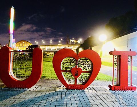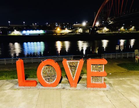 逛完饶河夜市后踱步过来,气温晚上有些偏凉,不过对于特别容易燥热的我来说正好,风吹吹。走到了松山的彩虹桥,rainbow bridge,谷歌地图还是相当精准。S型的桥,红色的很是惹眼。连接了松山区饶河街和内湖区新明路的一座钢结构的桥,造型比较别致,中间是基隆河,两岸有灯光倒影,拍照还比较好看。白天晚上来的感觉应该不同。周边有人唱歌,喇叭身影洪亮,走走看看,有些慢跑的人,还有情侣都在滨江边锻炼、散步。两边都有LOVE(红色的)艺术装置,可以过来打卡比心,这里就是彩虹桥下的爱情广场,给我锁住