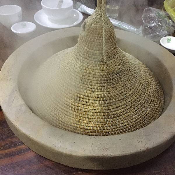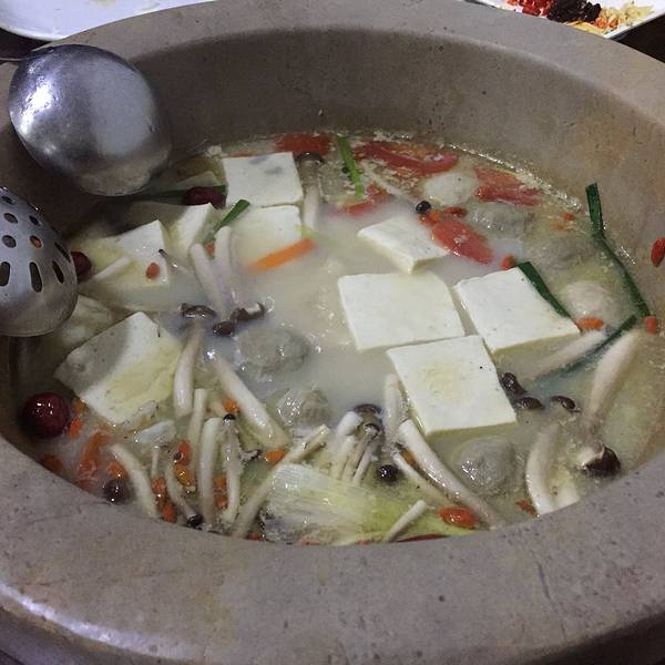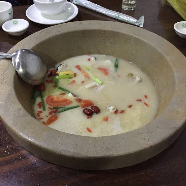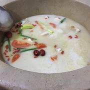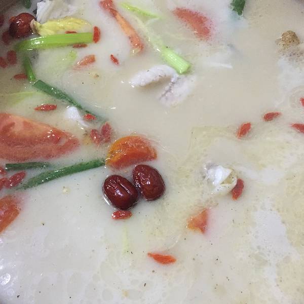 第一次去想见到。戴草帽的鱼石头做的锅底。整个外形做出来的你的颜色鱼汤很白呀。颜色很美吧。