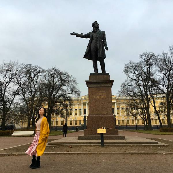 圣彼得堡艺术广场,位于俄罗斯博物馆正前方,椭圆型的广场美丽精巧,广场中央矗立着普希金的雕像,诗...