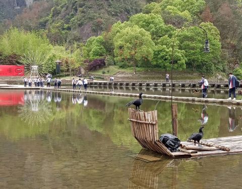 很悠闲的漂流,四十分钟左右,山水凉快又清澈。买票较为不变,网上买的是要四个人起卖。两个人的话建议景区等待,和别人拼单漂流。55元一个人,船上的座位是四个人的,还要花20元遮阳伞的费用。