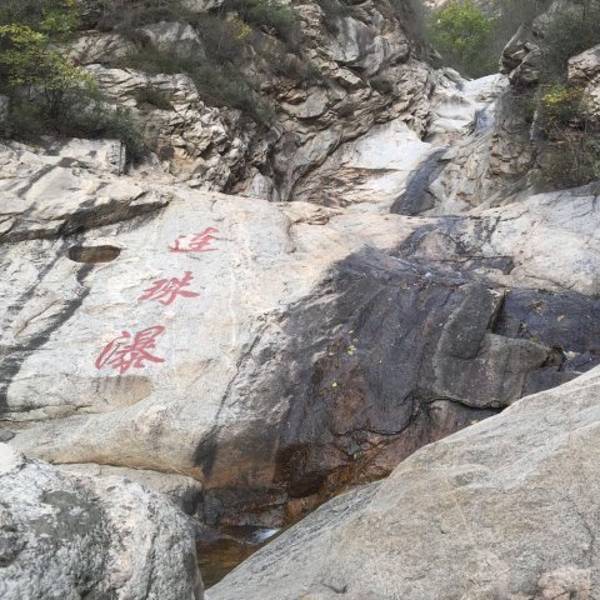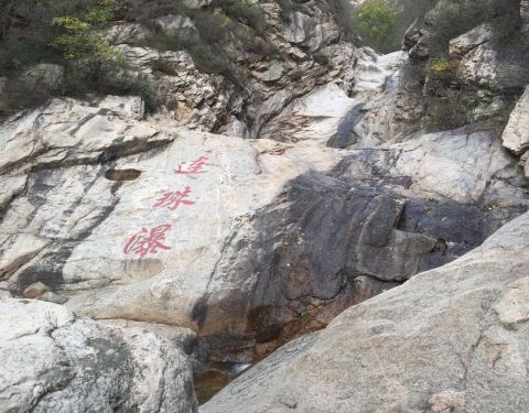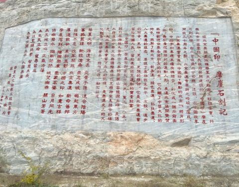 云龙涧风景区门票每人35元,缆车票往返每人110元。徒步登山,体力好的话一个半小时。山顶大块石头上刻有“中国印摩崖石刻”,是专门为2008年北京奥运会刻的。石刻下面有一个平台,站在平台上,抬头往上可以看到摩崖石刻文字,往下可以看到密云水库以及京密引水渠的起点,还可以看到山下的村镇。