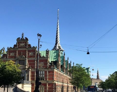这个证券交易所的外观看上去就非常的显眼,它有一个像麻花一样的尖顶,这个交易所历史悠久,目前仍然在使用,是丹麦最重要的一个金融衍生品交易场所。