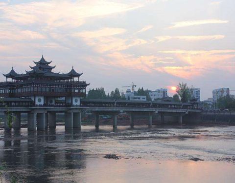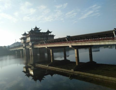 位于黄山市中心,新安江上的一座过江大桥,远看大桥造型非常优美,桥中央模仿扬州瘦西湖五亭桥式的样,两旁以传统的廊桥连接两岸。