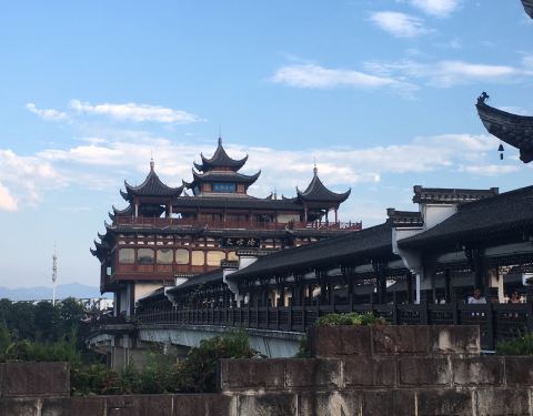 一座横跨新安江的现代化廊桥。汽车道,非机动车道,人行道,有特色的是下雨天不带伞在这里也不用犯愁了。桥身中央的亭台楼阁雕梁画栋很是气派。