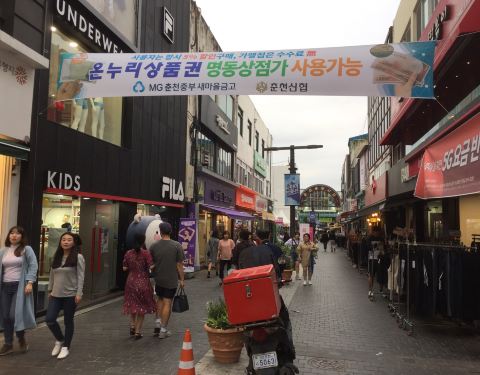 位于春川的中心地带,虽然春川沒有明洞这个地方,但习惯上繁华热闹的街区称为”明洞“,春川市朝阳洞街区就被称为明洞。该购物街背后是春川有名的小吃街,以鸡排炒年糕闻名,附近还有中央市场和春川地下商街。建于1962年的中央市场是春川最大的农贸市場,販售当地出产的水果。春川明洞街区,曾被用作电视剧冬季恋歌的背景,也是冬迷必到之地。很漂亮!