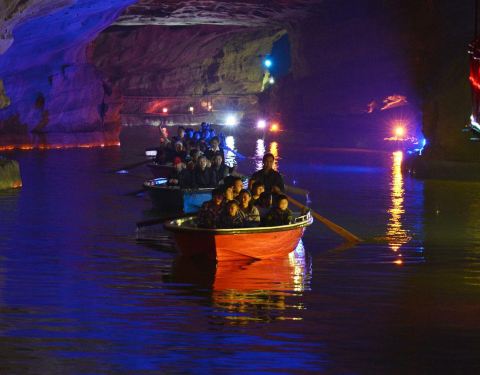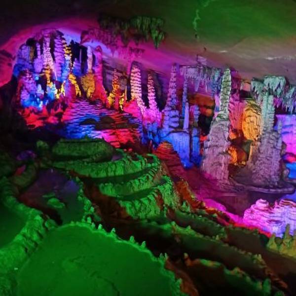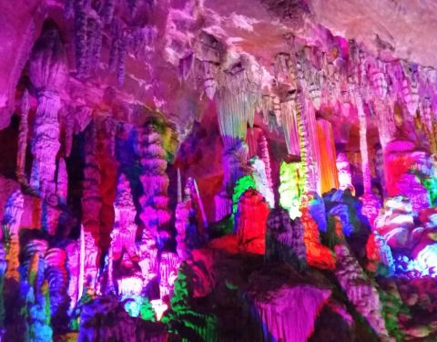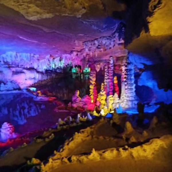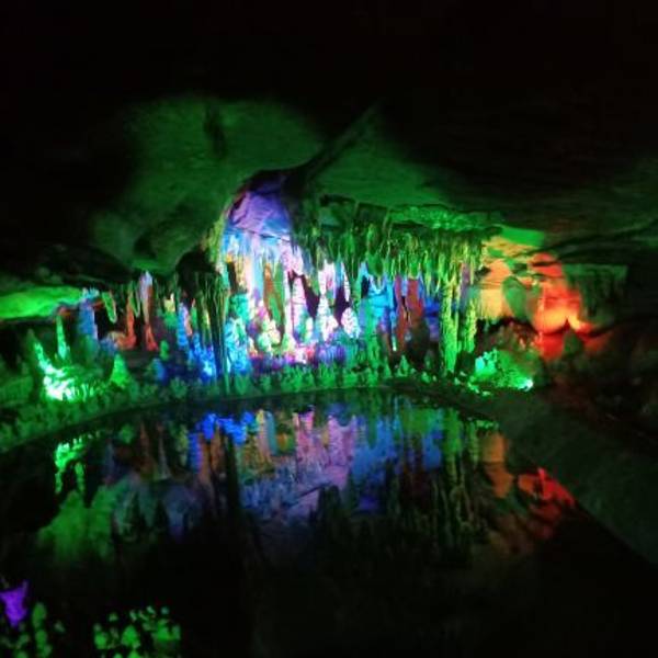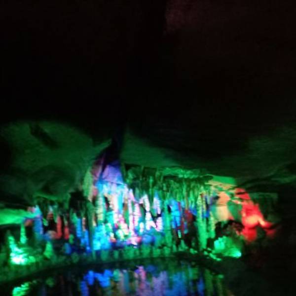 三月中旬去过,在观景灯的呼应下非常漂亮。后来人给这里编写了很多现代神话,什么飞瀑,罗马柱,如椽大笔,动物世界,瓜果菜蔬,几乎每一处都有故事。听着导游讲,仿佛自己也进入了这故事中~~ 在我们走过洞中的幽境后,来到了一片水域,居然在山腹中还有一条河,真算得上是意外的惊喜。这里水还比较清澈,能看到水底的岩石,我们坐着小舟体验了一把洞中泛舟的快感。出了洞口,还要走几百米栈道,非常漂亮。很值得去的地方,我的几个好姐妹清明小长假也准备去玩。